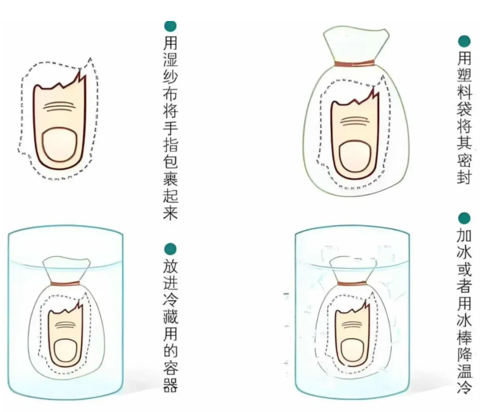 手外伤后伤口加压包扎,离断指体用干净敷料包扎以后外用塑料袋子包裹,周围放置冰块冷藏干燥保存。切忌不要把指体浸泡在任何液体里。