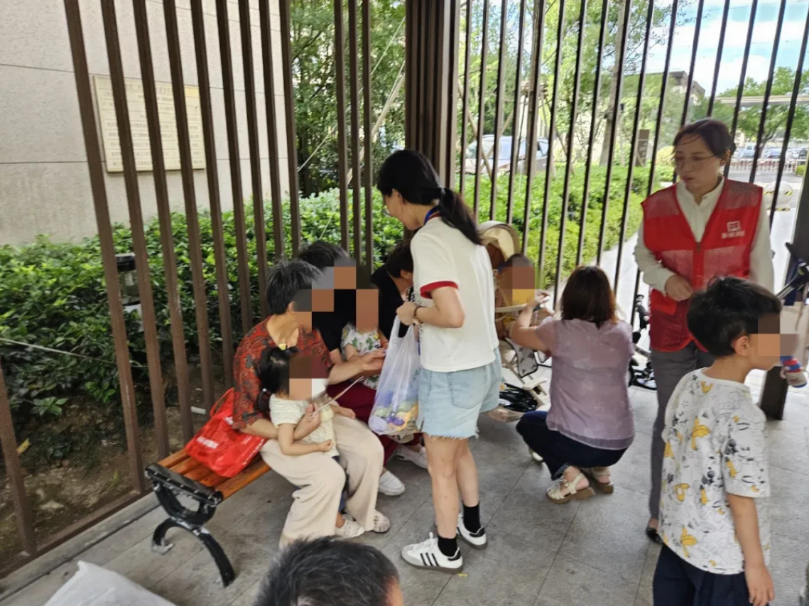 香包到位后,社区网格力量持续发力,成为温暖传递的“主力军”。百合社区假日学校的小朋友们在社区网格员的全程陪同下,带着香包走进各小区。孩子们手中的“花篮”格外亮眼——这是社区假日学校开展的垃圾分类“变废为宝”手工课成果,由网格志愿者手把手教孩子们用废弃塑料瓶制作而成,小巧的花篮里装着香包,既是心意也是环保理念的传递。