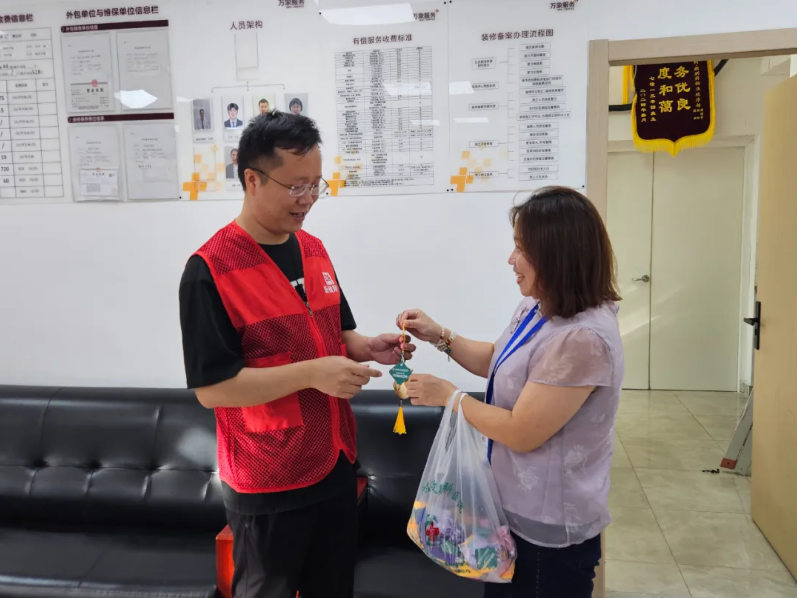 除了入户送递,百合社区微网格员们则化身“移动投递员”,带着香包走遍辖区各小区的电梯间、楼道等公共区域。“电梯里、楼道里人来人往,把香包挂在这里,能让更多居民受益。”微网格员华雪平一边将香包挂在电梯按键旁,一边说。从单元楼门口到高层电梯间,微网格员们用脚步丈量网格,确保社区各个公区都能飘起清凉药香。