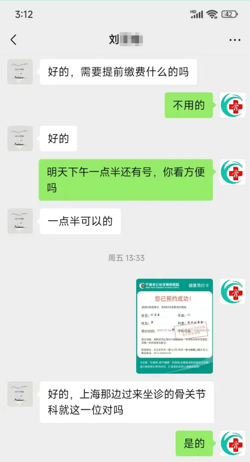 7月25日,在象山市的35岁刘先生偶然看到北仑长征骨科医院公众号发布的消息——上海同济医院运动医学科主任程彪团队坐诊长征骨科医院,没有丝毫犹豫,当即和我院联系,问清楚上海专家坐诊时间后立马预约了专家号。
